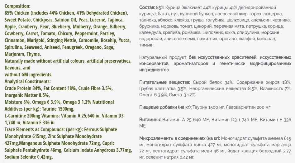 Мы очень внимательно изучили состав корма. Более того – состав мы брали на сайте производителя и сравнивали его с русским переводом на упаковке. Неточностей перевода найдено мало. Это говорит о том, что продавцы товара и производители не преувеличивают достоинств корма. Анализ состава подтверждает – это 100% холистик.