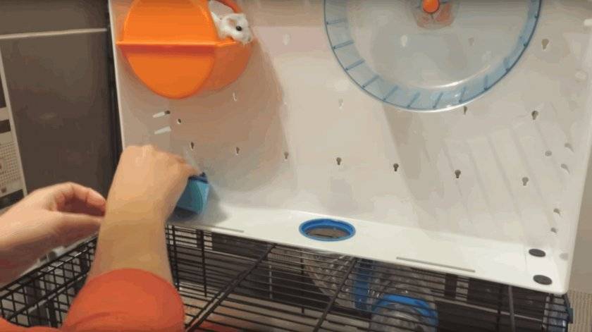 Мытье клетки не займет у много времени. Достаточно одной уборки в неделю. Сначала нужно извлечь грызуна и поместить его в любую емкость: в банку, коробку либо прогулочный шар. Затем извлекают все атрибуты, которыми пользуется грызун: лестницу, колесо и др. Содержимое клетки полностью удаляется. Под теплой проточной водой вымывается днище, поилка, кормушка, а также все остальные аксессуары.