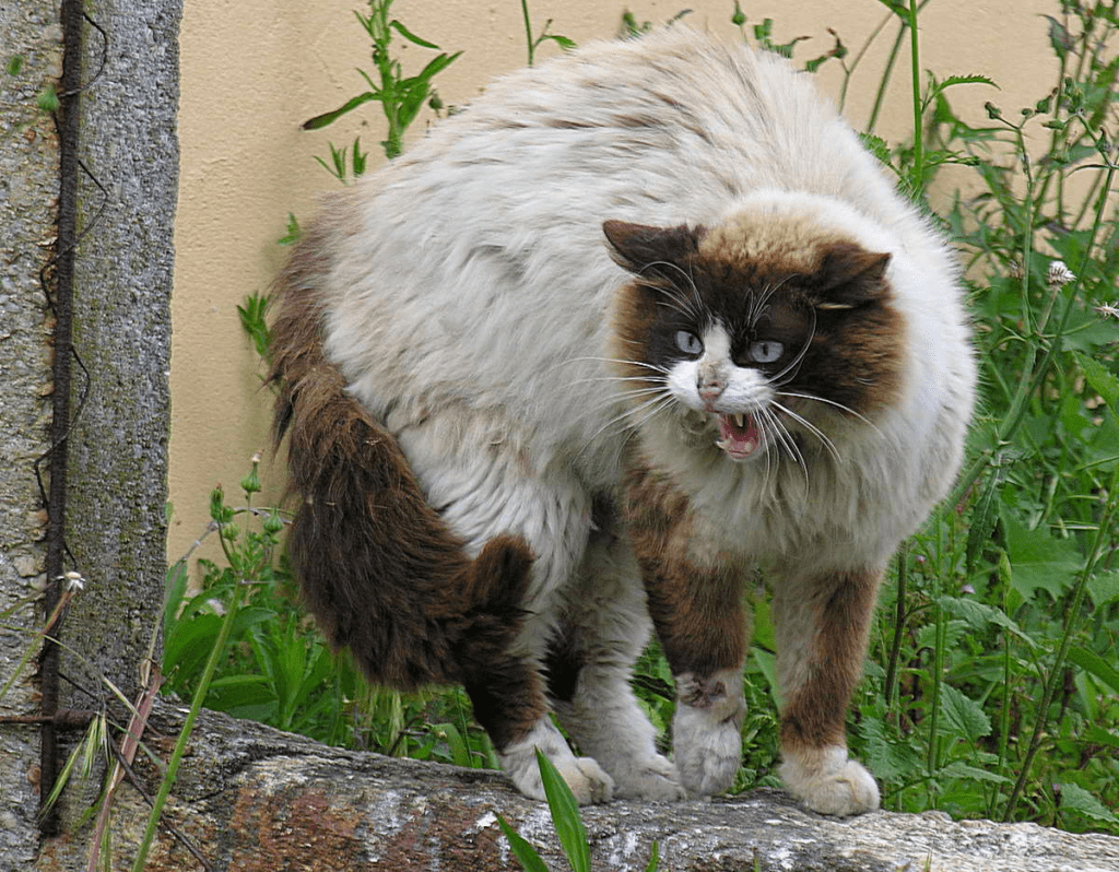 Выгнутая спина и шерсть дыбом демонстрирует угрозу. Так кот желает казаться больше, чем он есть на самом деле. Чаще всего таким видом кот пугает собаку. Если она при этом держит голову прямо, то она не боится своего противника.