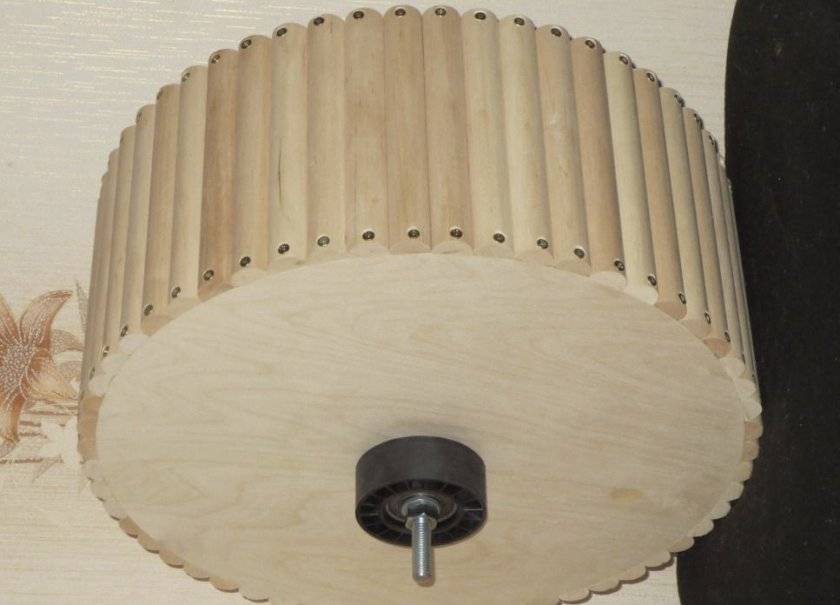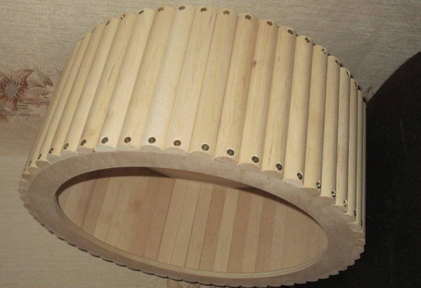 - Деревянные дощечки прикручиваются к внутренней стороне кольца с помощью тонких саморезов, кольцо крепится снаружи фанерного круга с помощью болта.