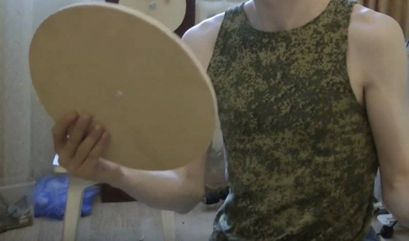 - На фанере нужно сделать отверстие электролобзиком, которое находится на расстоянии 15 см от центра. На другом листе делают два отверстия: одно на расстоянии 15 см, другое — 12–13 см.