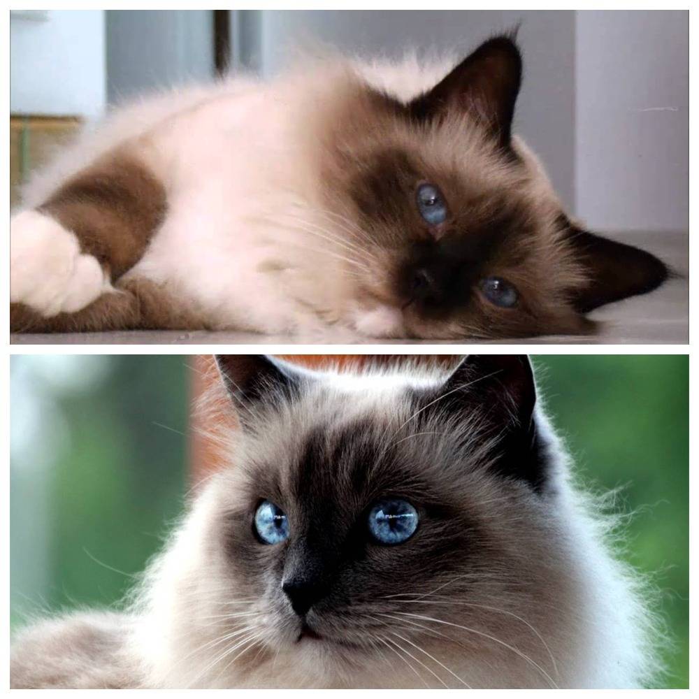 Первым прокрашивается носик, проступают очертания маски на мордочке, затем темнеют лапки, ушки, хвост… К двухнедельному возрасту котёнка опытный заводчик уже сможет предполагать: какое же взрослое животное получится из этой милой крохи. Конечно, генетически это можно пытаться предполагать и заранее, но природа вообще большая любительница преподносить человеку сюрпризы, а уже таинственная природа священной кошки — и тем более.