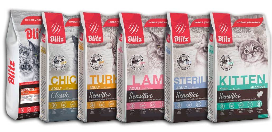 - специальные корма «Blitz Sensitive» – включает в себя четыре виде кормов, произведенных из гипоаллергенных источников животного белка (индейка и ягненок), которые ориентированы на котят, беременных и кормящих кошек, взрослых питомцев с чувствительным пищеварением и стерилизованных животных.
