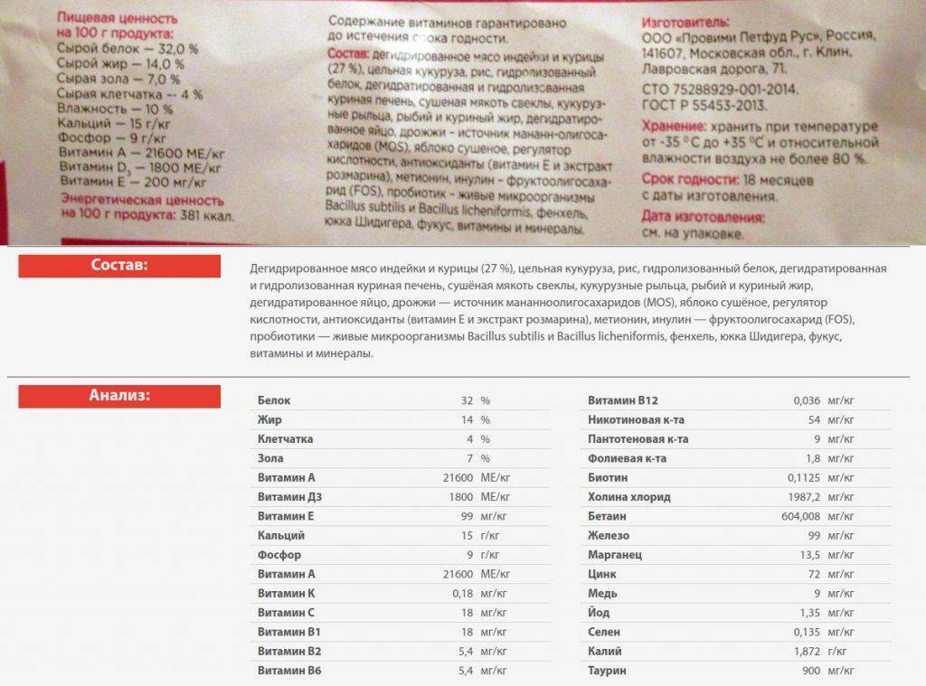Рассмотрим состав корма Blitz на примере варианта for Adult Cats Turkey (для взрослых кошек с индейкой). Посмотреть его можно ниже, кликните по изображению чтобы увеличить его для удобности чтения: