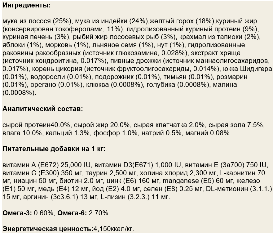 - В составе указано, что используется «мука из лосося, индейки и т.д.», но не говориться, что это именно мясо. Таким образом, производитель может добавлять в рацион помимо мяса субпродукты. Однако, в аналитическом составе показан достаточно высокий уровень протеина – 39%. Поэтому, даже если и используются субпродукты, то они богаты белком.
