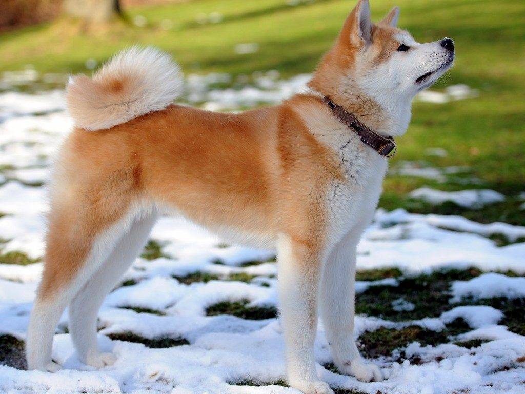 - Акита — имеет такие окрасы – белый, рыже-белый (белый цвет на морде груди и лапах), тигровый рыже-белый. Ростом достигают шестидесяти сантиметров в холке и весят в среднем до тридцати пяти килограммов. Акита — имеют густую, мягкую, но прямую шерсть. Они отличаются крепким телосложением и мощными лапами.