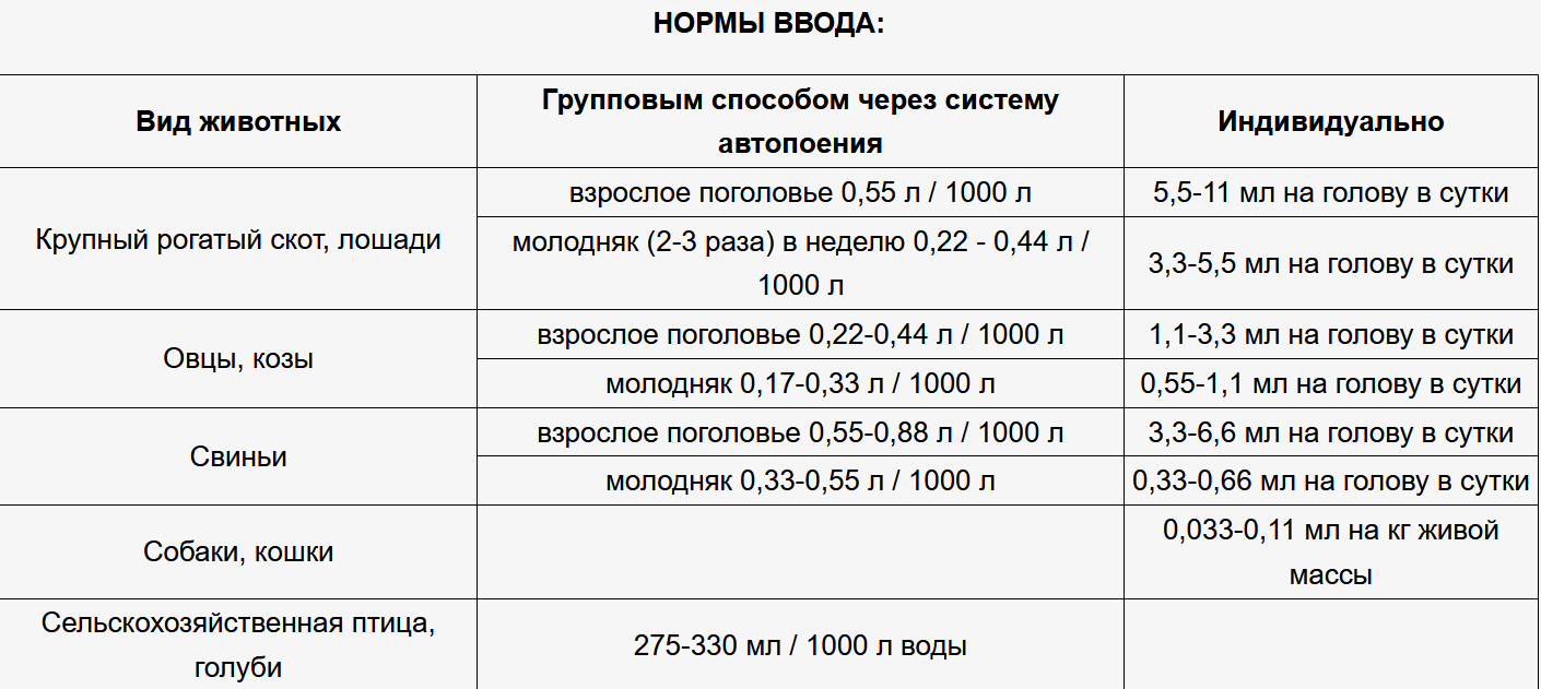 Чаще всего его применяют для птиц, но предназначен он для свиней, крупного рогатого скота, коз. Специалисты рекомендуют препарата также в качестве профилактики собакам, кошкам, голубям.