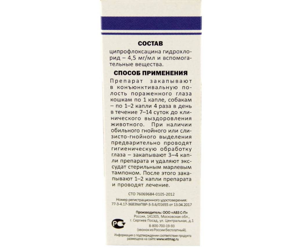 Период выхода препарата из организма — 3-5 часов. Ципрофлоксацин выводится в неизменном виде через почки, незначительное его количество — с желчью и калом. Нарушение работы почек может привести к замедлению выхода ципрофлоксацина из организма питомца.