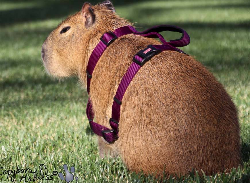 Это животное относится к отряду грызунов. Гигантских дружелюбных грызунов. Капибары вырастают весом до 65 килограммов и очень дружелюбны. Эти питомцы быстро привыкают к своим хозяевам, прекрасно уживаются с другими домашними животными. Капибары по внешности напоминают больших морских свинок, хорошо поддаются дрессировке и совсем не проявляют агрессию. Капибарам необходим для полноценной жизни небольшой бассейн или хотя бы таз с чуть тёплой водой и они свободно передвигаются по комнатам. Питаются капибары травой, сеном и овощами, вполне могут употреблять в пищу корм для кошек или грызунов. В домашних условиях капибары живут до 12 лет.