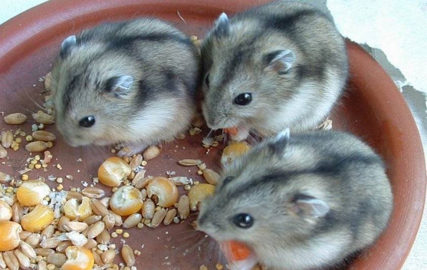 Что едят карликовые хомяки? По сути, они являются всеядными, но это не значит, что их можно кормить всем, что есть на столе человека. Для грызунов есть свой рацион. Его основа – кормовая смесь, содержащая семечки, зёрна, витамины. Как правило, смесь дают на ужин, ведь хомячок – сумрачное животное, ночь для него – самое активное время суток. На завтрак зверёк должен кушать низкокалорийную пищу. Подойдут, фрукты, овощи, кукуруза, бобовые, листья одуванчика. В качестве белка – рыба, куриная грудка. Обязательно следите, чтобы миска с водой у питомца всегда была наполнена. Убирайте испорченные продукты, иначе возможно отравление. Небольшое количество еды всегда должно находиться в тарелке.