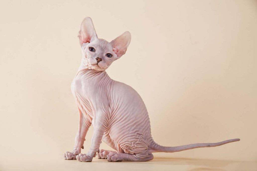 Рождаются почти все они голенькие, а вырастая, начинают приобретать отличительные видовые особенности. В породе выделяют три вида. У одного шерсть совсем отсутствует. Кошки велюровой породы покрыты короткой шерстью длиной до 3 см. А вот дончаки вида браш носят жесткий курчавый волосяной покров.