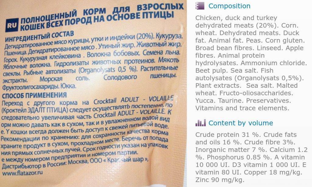 Рассмотрим состав корма Flatazor Crocktail на примере варианта Adult Multi with poultry and vegetables (для взрослых кошек, с птицей и овощами). Посмотреть описание состава можно на изображении ниже (нажмите по картинке чтобы увеличить её для удобности чтения):