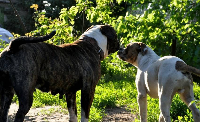 В домашних условиях американские бульдоги легко уживаются с другими животными, но при условии, что они ему подчиняются. На улице на встречных собак почти всегда нападает. Такие попытки нападения нужно пресекать.