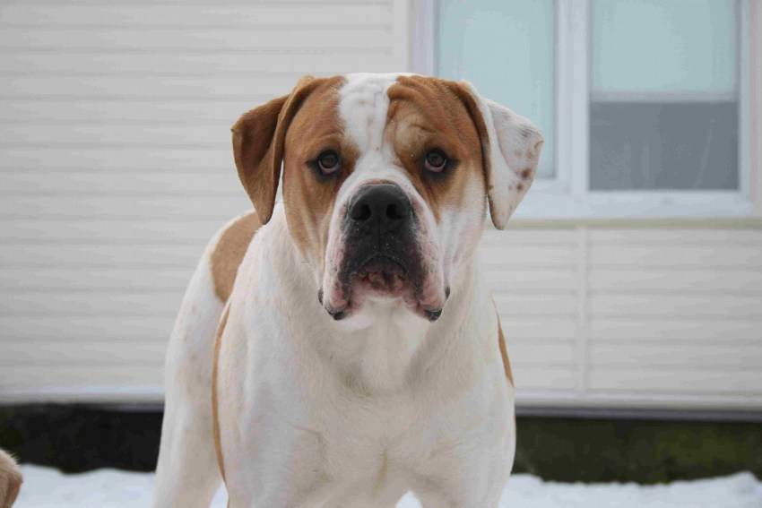 Хвост свисающий. У собаки очень крепкие конечности и она может развивать большую скорость при беге, это особенно хорошо, если собака понадобится вам для охоты. У этой породы морда квадратная, а цвет глаз в основном черного цвета, но может быть и другого, это не будет считаться отклонением от породы. Выглядит собака, очень даже добродушно, благодаря своим мягким ушам образующими одну линию с макушкой, они треугольниками свисают по обе стороны массивной головы. Американский бульдог имеет гладкую и короткую шерсть, в основном белого цвета. Бывает и другой окрас, но присутствие белых пятен является обязательным для этой породы.
