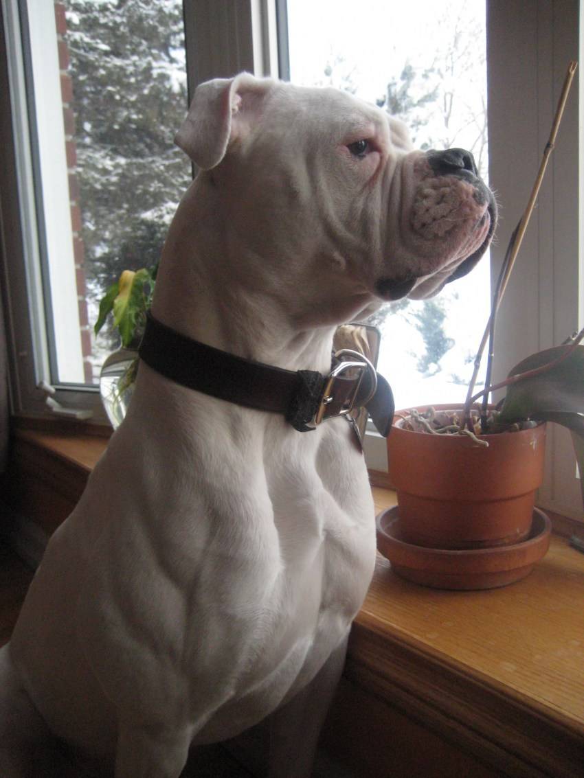 Американский бульдог на фото чем-то напоминает быка: такой же широкий, мощный и сильный. Некоторые утверждают, что пес унаследовал такой экстерьер, пытаясь подражать своему сильному врагу на арене. Разумеется, это неправда.