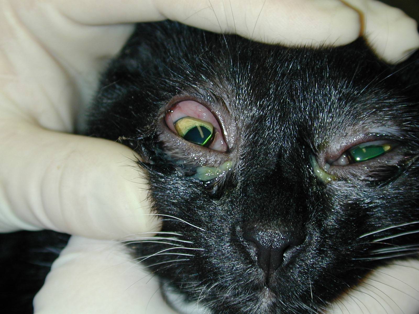 Опасность распространения инфекции между кошками заключается в том, что животное может быть просто бессимптомным носителем инфекции (до 12% всех случаев). В остальных случаях – это глазная и легочная формы: покраснение конъюнктивы, сильный отек, выпирание третьего века, активное слезотечение, параллельно появляются истечения из носа, кошка начинает чихать и тереть лапами мордочку и глаза. В редких случаях может появляться кашель.