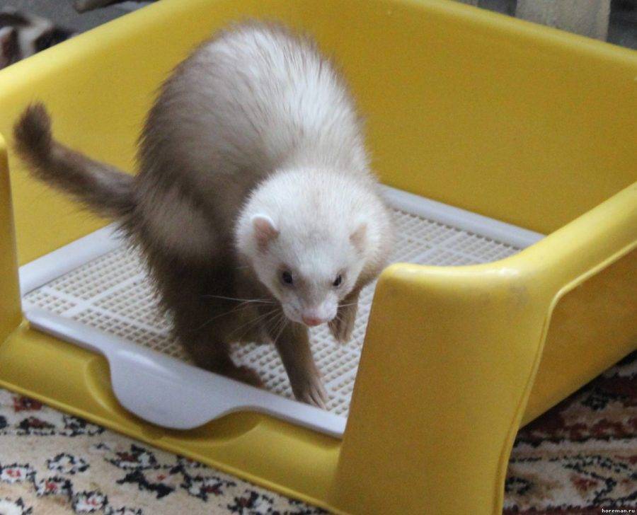 Понять, что хорёк хочет в туалет можно по его действиям. Если животное начинается пятиться и поднимает хвост его срочно нужно отнести в туалет.