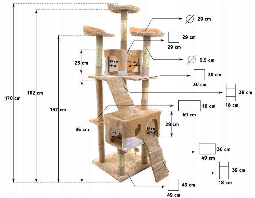 Перед тем как приступить, следует продумать конструкцию будущего изделия. Она должна быть устойчивой и безопасной для питомца. В качестве основы для комплекса используют три элемента, параметры которых изображены на схеме.