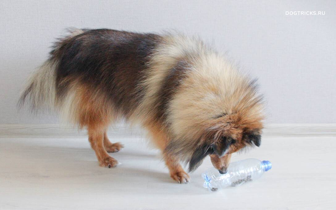Суть данной игры заключается в том, что вы проделываете в пластиковой бутылке несколько отверстий, наполняете ее лакомством и кидаете на пол. Собака должна катать бутылку носом или лапами, вытряхивая таким образом корм.