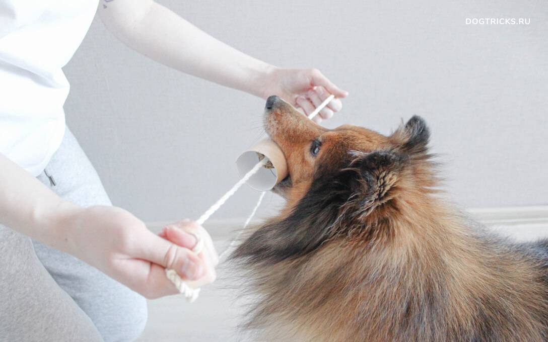 Данная игра заключается в том, что вы показываете собаке веревку с надетым на нее основанием из-под туалетной бумаги, под которым спрятан крупный кусок лакомства. Задача собаки — взять в зубы основание и передвинуть в сторону, чтобы открыть доступ к весящей еде.