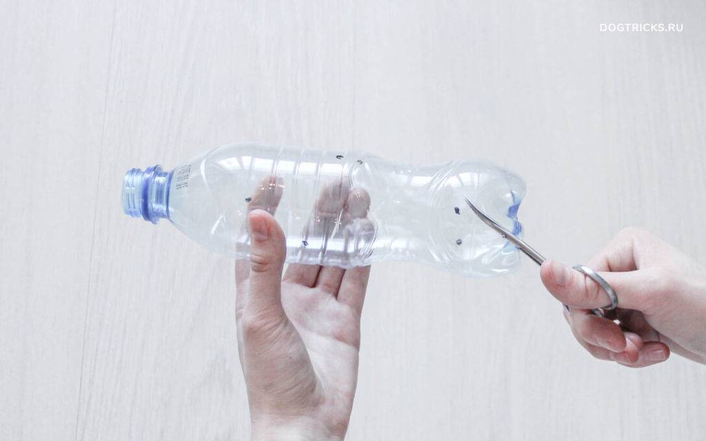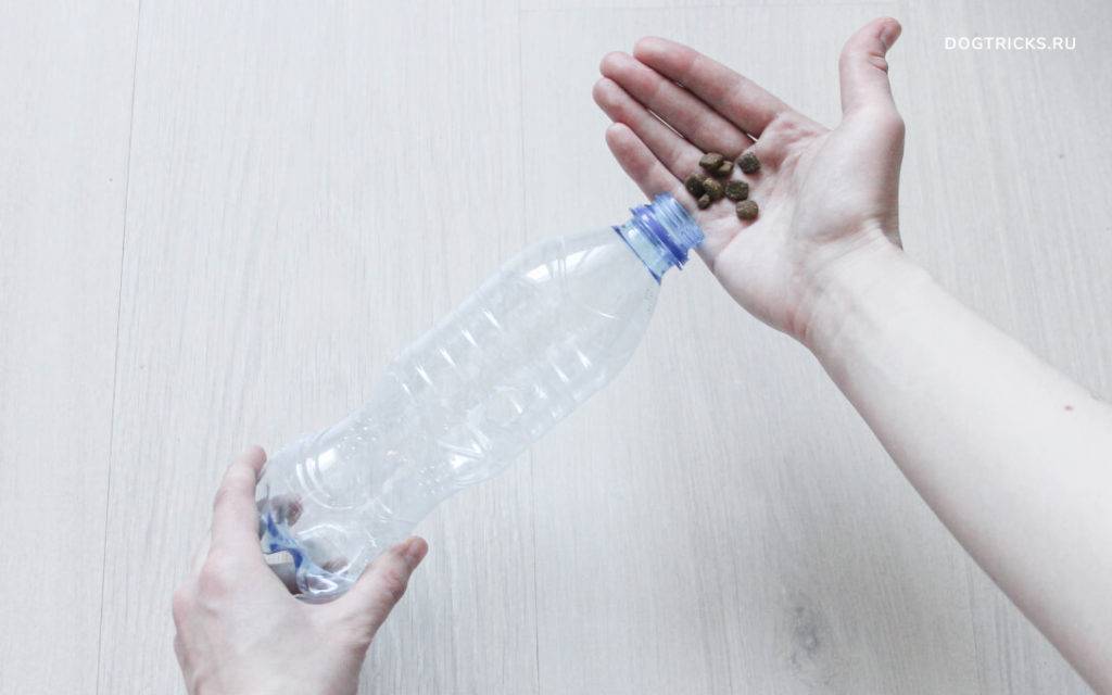 Суть данной игры заключается в том, что вы проделываете в пластиковой бутылке несколько отверстий, наполняете ее лакомством и кидаете на пол. Собака должна катать бутылку носом или лапами, вытряхивая таким образом корм.