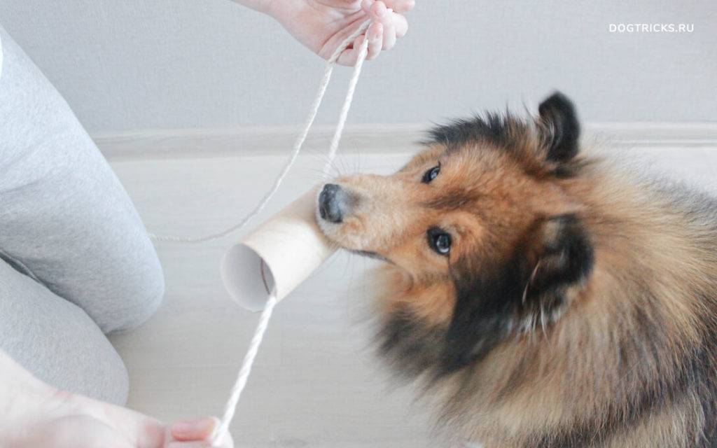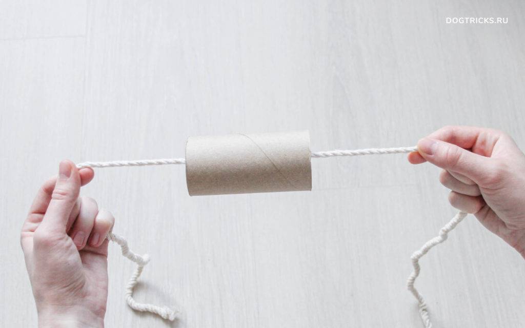 Данная игра заключается в том, что вы показываете собаке веревку с надетым на нее основанием из-под туалетной бумаги, под которым спрятан крупный кусок лакомства. Задача собаки — взять в зубы основание и передвинуть в сторону, чтобы открыть доступ к весящей еде.