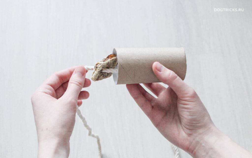 Шаг 3. Проденьте веревку через лакомство и основание из-под туалетной бумаги.
