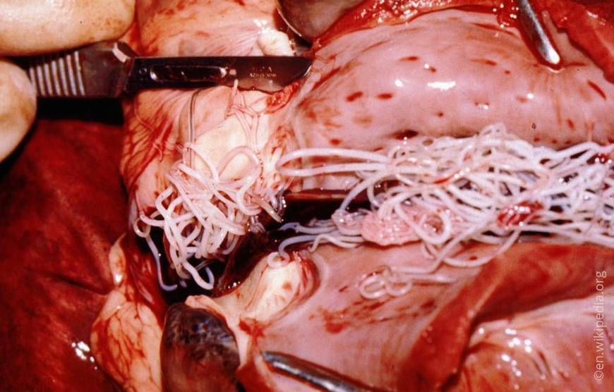 - Существуют глисты, личинки которых проходят цикл в сердечной мышце. Это со временем приводит к истончению стенки и обширному поражению. Они обычно передаются с укусами комаров. Паразиты могут жить также в аорте и легочной артерии, повреждая стенки, выделяя токсины.