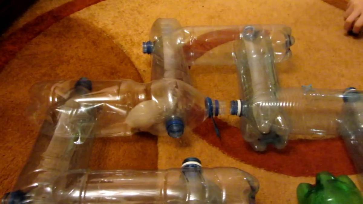 Для работы нужен канцелярский нож, ножницы и изолента. Конструкция состоит из одинаковых узлов, расположенных в произвольном порядке. Каждый узел состоит из двух бутылок, одна из которых «пронзает» другую под прямым углом. Возьмите две бутылки:
