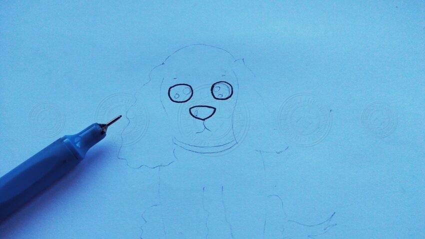 - Нарисуйте уши пса. Дорисуйте пальцы на лапах