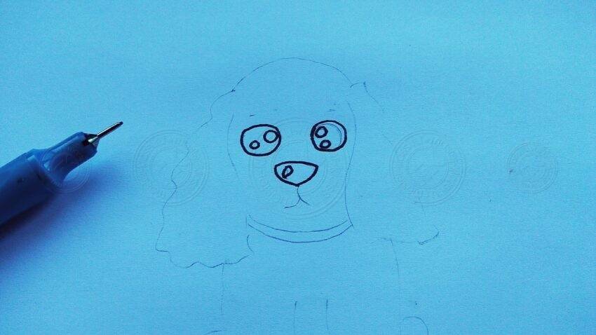 3. Рисуем круглые глаза, словно бусины внутри окантовки. От низа носа проводим линию, которая изобразит рот и щечки собаки.