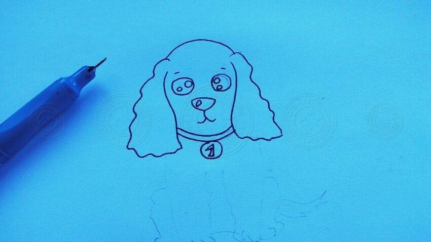 7. Туловище щенка рисуем тонким и маленьким по сравнению с размером головы. Не забудьте ошейник, а медальон на нем может быть любым, каким только пожелаете: звездочка, сердечко, солнце.