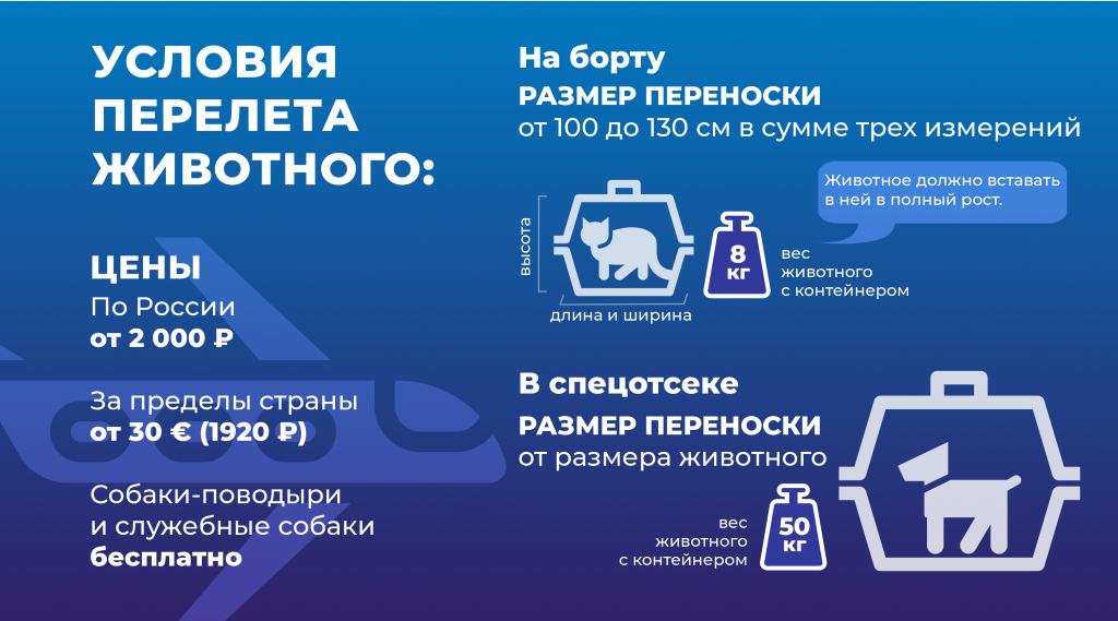 В международных путешествиях авиакомпания берет за провоз животного от 50 до 150 евро в зависимости от его размеров.