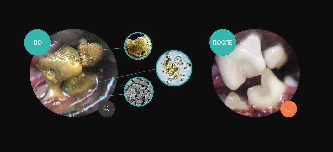 Для очистки ротовой полости домашнего любимца от зубного камня и налета применяется специальный аппарат чистки зубов собак ультразвуком. Скалер уз-аппарата способен проникнуть до самых труднодоступных мест, а сам процесс, использующий ультразвуковые волны, помогает разрушать зубные отложения и камень на микроуровне.