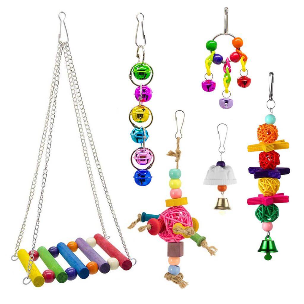 - Аксессуары для поддержки физического тонуса птицы. К таким забавкам относятся качели, лесенки, канаты, то есть такие игрушки, с помощью которых попугай может лазить, висеть. Такие аксессуары часто используют для организации игровой зоны своего любимца. Благодаря этим игрушкам, пернатый любимец двигается, что положительно влияет на его состояние.