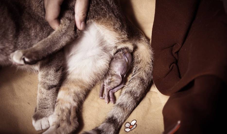 Иногда показываются лапки, после чего котенка заклинивает в родовых путях