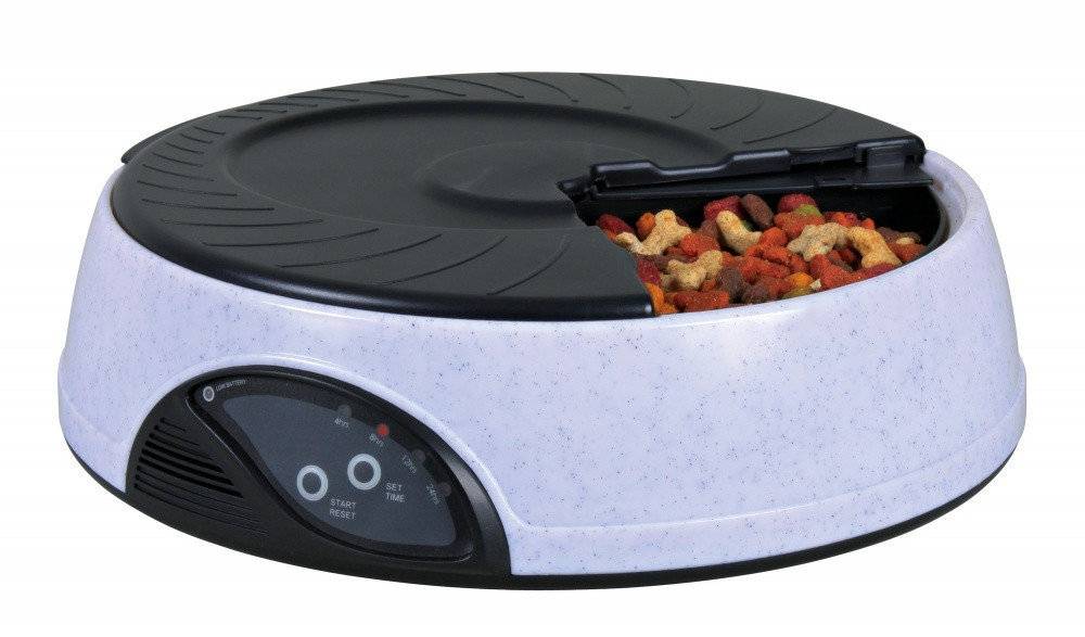 Электрический прибор, позволяющий организовать 6 кормлений. Лотки небольшого размера. Сам прибор работает на батарейках. Присутствует функция записи голоса, который звучит перед подсыпанием в ёмкость корма.