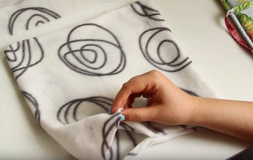 - Сшейте прямоугольную заготовку по трём сторонам, чтобы получился двухслойный квадрат. Поскольку ваша заготовка прямоугольная, достаточно просто сложить её пополам и сшить нитками по трём открытым сторонам.