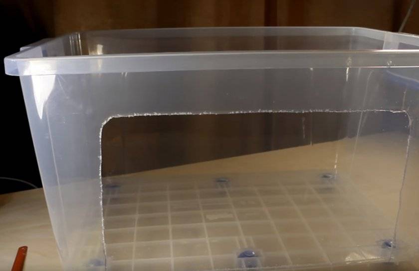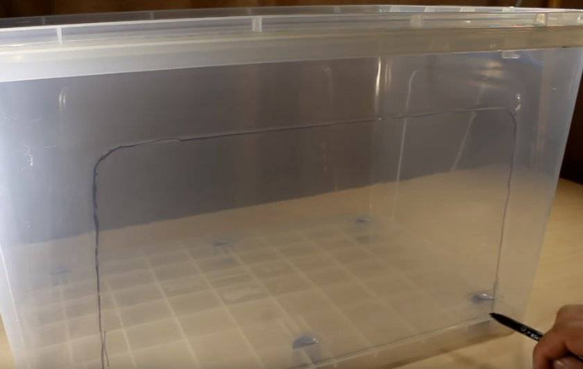 - Сбоку по «фасадной» части делаем разметку маркером. Это нужно для того, чтобы потом вставить стекло для наблюдения за зверьком.
