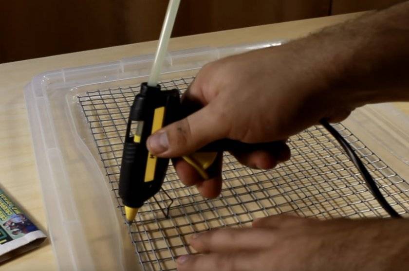 Вырезанную сетку фиксируем клеевым пистолетом.