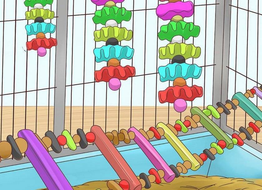 Качельку чаще крепят к центру потолка — так будет достаточно много пространства, чтобы питомец мог раскачиваться. Лесенки устанавливают на пол и фиксируют к одной из жёрдочек. Если домик высокий, можно разместить две лесенки, которые зигзагом будут переходить от одного шеста к другому. Игрушки нужно размещать так, чтобы они не перекрывали свободное пространство, которого и так не очень много.
