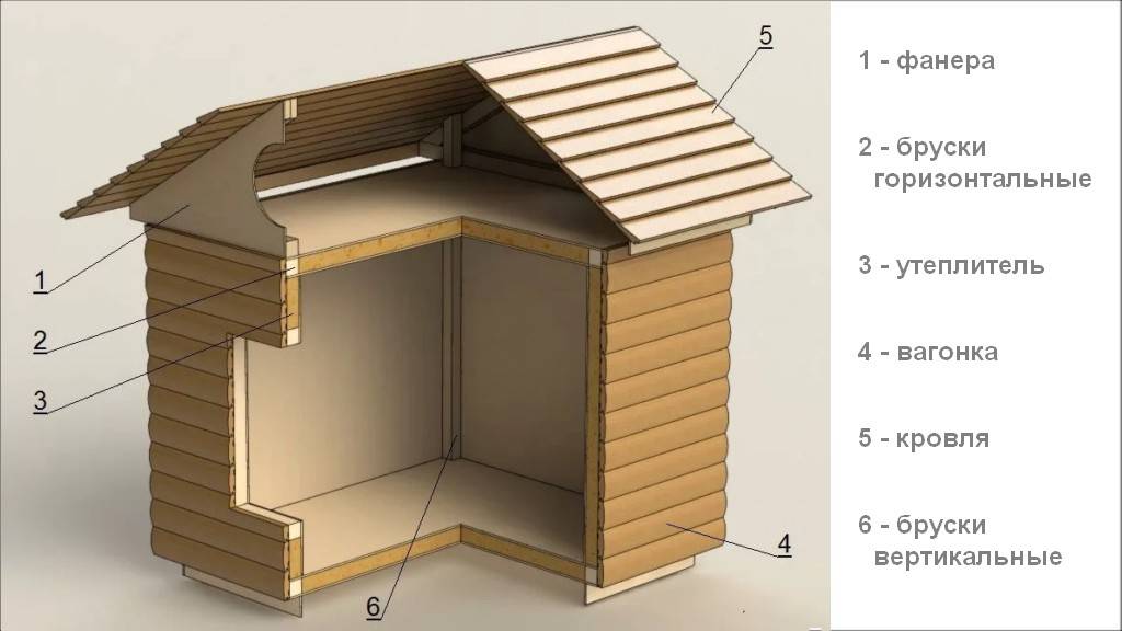 Каркас кровли, как правило, изготавливают из древесины. Поскольку металлические материалы в жару нагреваются, а в холод абсолютно не задерживают тепло. Чтобы осадки стекали не над лазом, уклон односкатной крыши, не менее 5-10 градусов направлен вниз над задней стенкой будки.