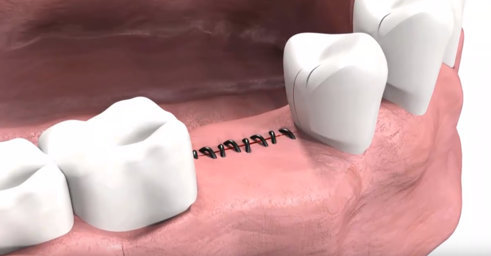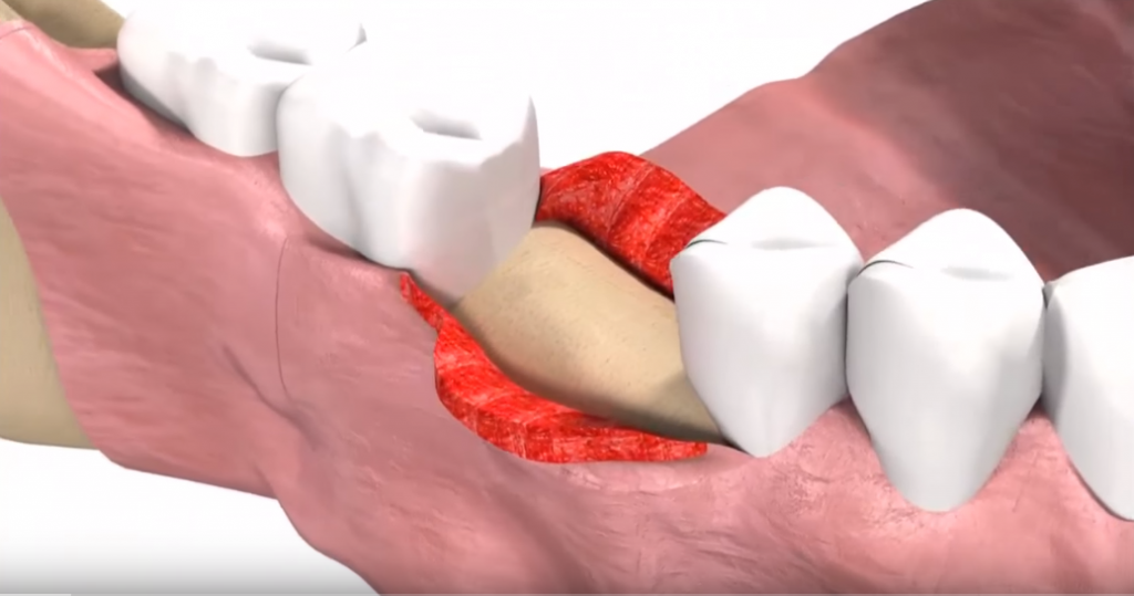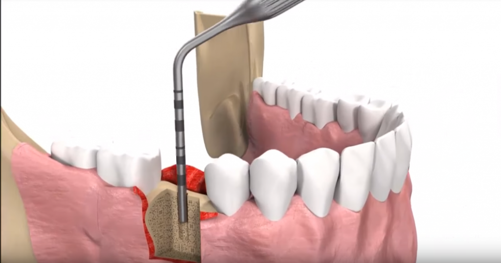 Для получения доступа к кости нижней или верхней челюсти врач делает небольшой надрез на десне и откидывает лоскуты.