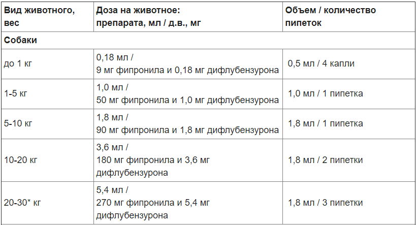 Если пес весит больше 30 кг, используют комбинацию пипеток из расчета: 0,1 мл на кг для обычного раствора и 0,18 мл на кг для Форте.