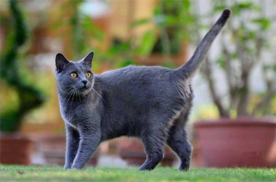 Хвост картезианки не особенно длинный и не сужается к концу, как у русской голубой.