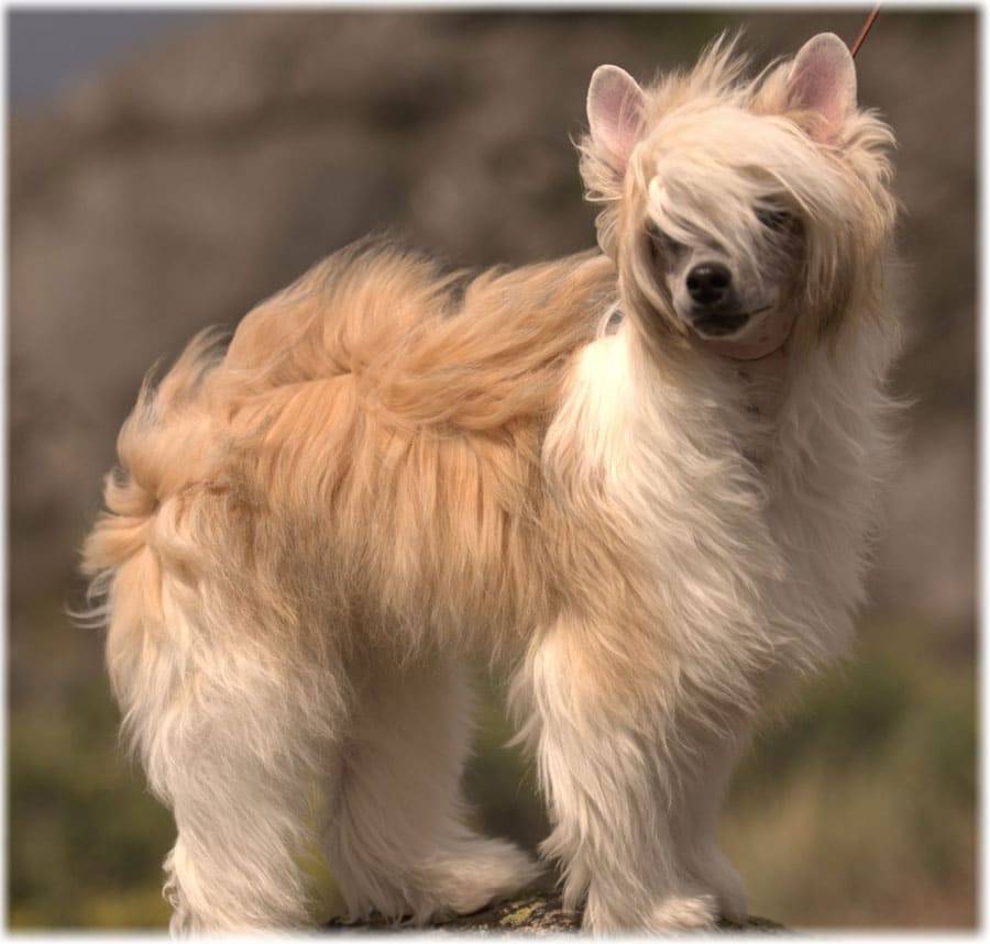 Пушистые китайские собачки, полностью покрытые мехом, похожи на маленькую афганскую борзую.