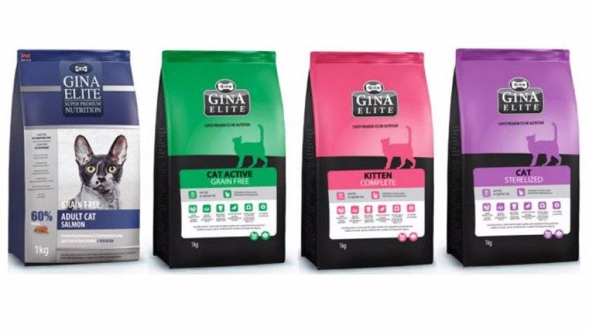 Производитель предлагает корма «Джина» и «Джина Элит» в виде сухого и влажного рационов.