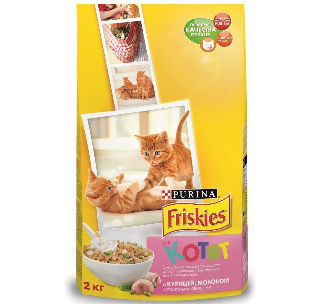 - Сухой корм Фрискис для котят с курицей, молоком и овощами. Состав практически не отличается от базового, но в роли вспомогательных компонентов к нему добавлены продукты переработки рыбы и молоко. Содержание белка в таком корме – не менее 35%.