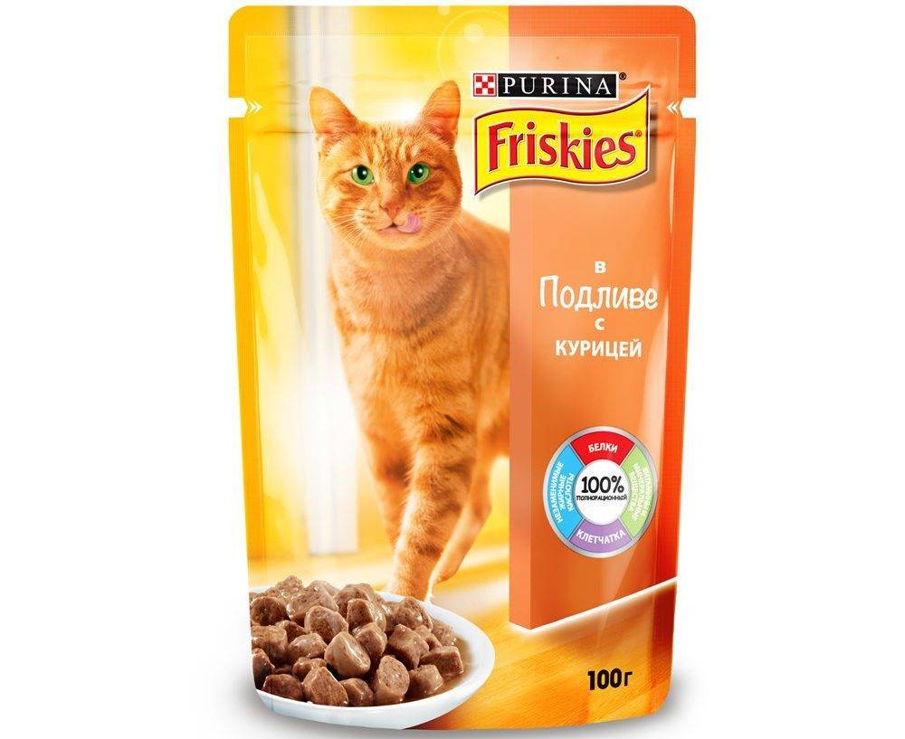 Для взрослых кошек, не имеющих проблем со здоровьем, марка Фрискис рекомендует использовать следующие продукты: