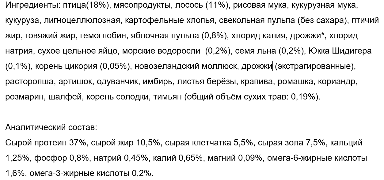 В этом корме содержится белок, который с легкостью усваивается стареющим организмом и не создает на него сильной нагрузки. Главным компонентом корма являются мясо птицы и субпродукты (19,5 %).